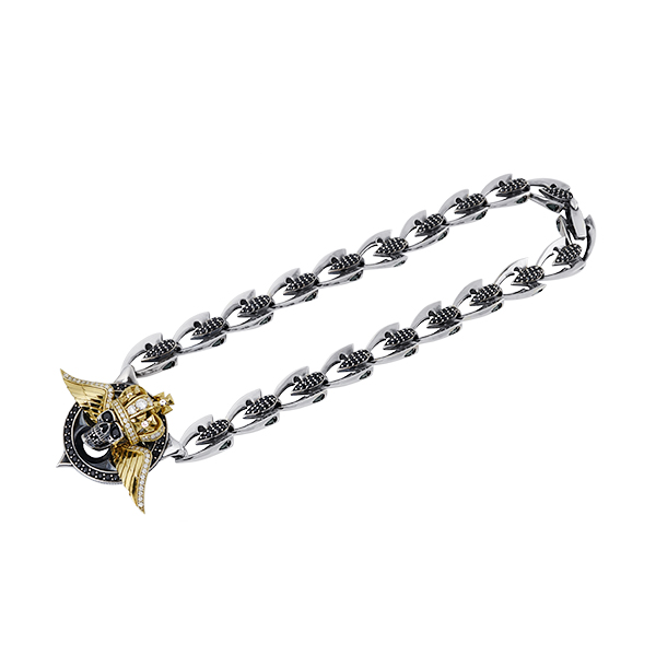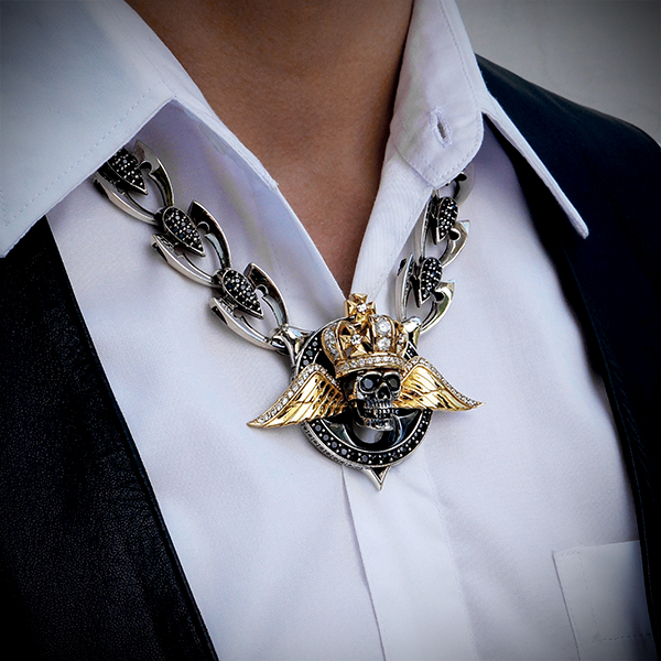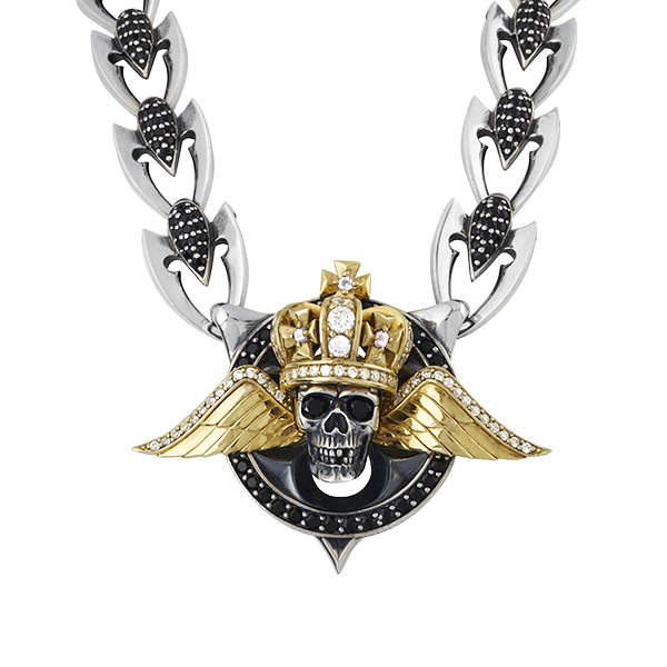 Ce collier est un collector de SoulFetish. Il allie l'argent, le plaqué or et de sublimes pierres fines sélectionnées pour leur beauté. Un magnifique travail de sertissage. Les ailes et la couronne sont plaqués or 18cts.