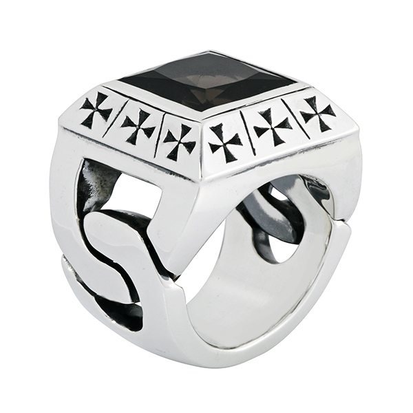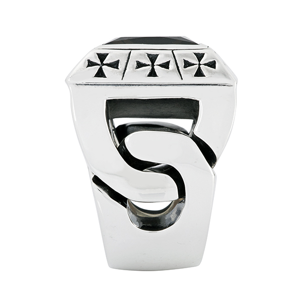 A multi faceted, square stone adorns the centre of the jewels face, catching the light as well as the eye. The mount, framed by a series of engraved Templar crosses, is striking in its detail. However, the true originality of Baron is only understood upon a closer look at the body of the ring. Much like the links of a bracelet, two distinct parts interlock to create large, elegant and refined shapes.