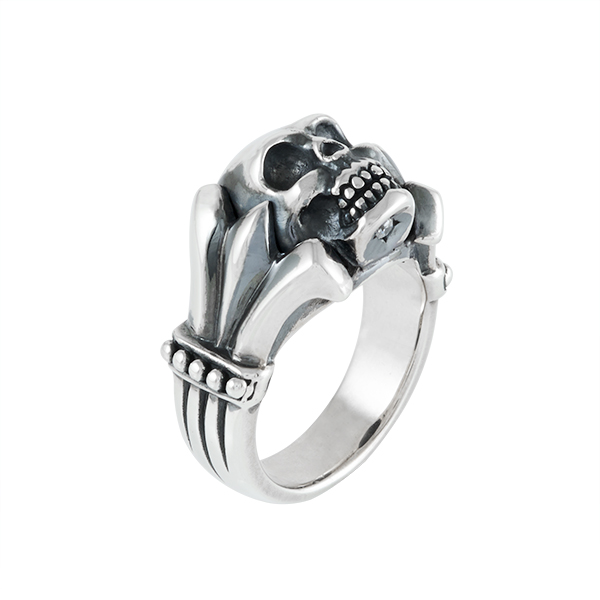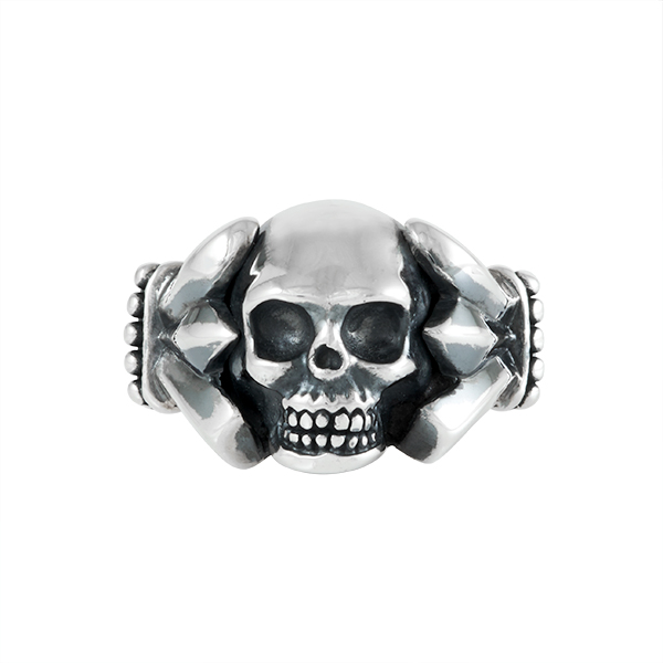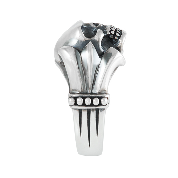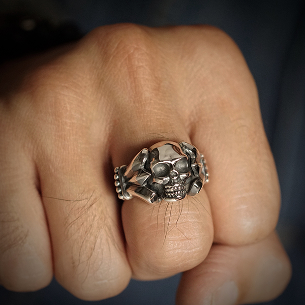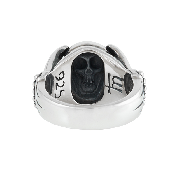 Biker style ring. A big soulskull insert in gothic column patern. Another secret skull face can be seen under the ring. A must have.