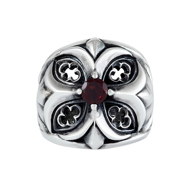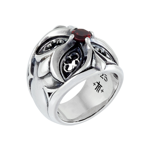 Gothic style ring set on top. The center is adorned with a delicate Gothic motif and a fleur-de-lys.