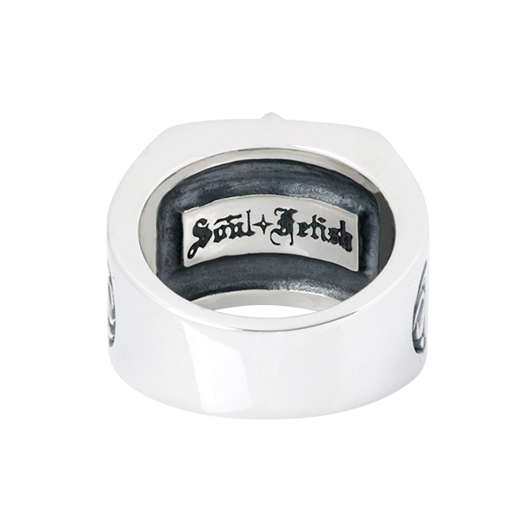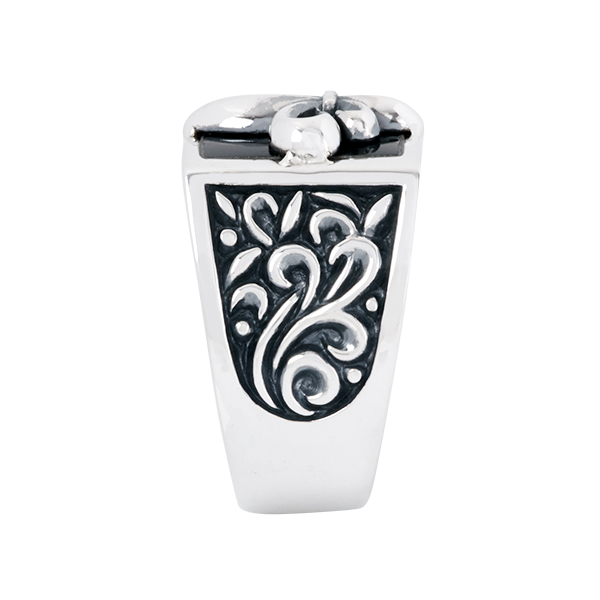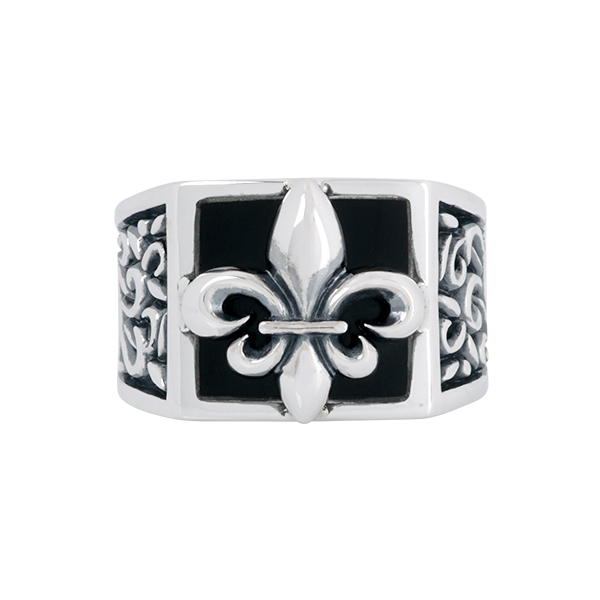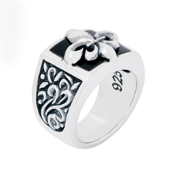 Gothic unisex ring. A typical "ChevaliƩre" with gothic ornament on the side. A onyx inlay is held by a lys flower added on top. Elegance and style.