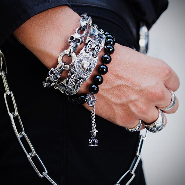 L=(wrist)ø18-19.5cm. Other size: contact@soulfetish.com Exuding a pure rock flavor, this simple bracelet of polished onyx beads is held together by a malevolent skull.