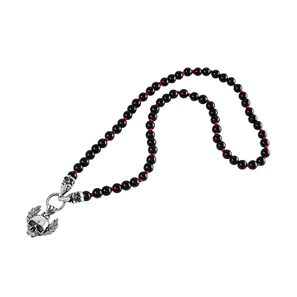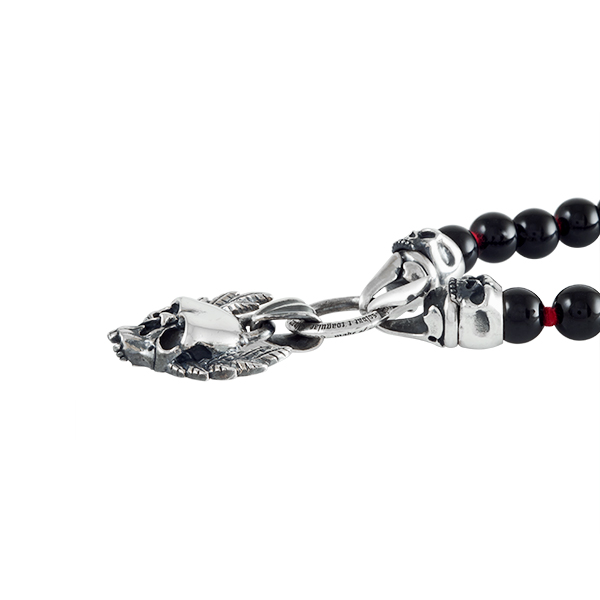 Necklace of pearls mounted on cotton tréssé in the manner of Buddhist amulets. Two skulls serve as a clasp around a ring supporting the Skulaurier SoulFetish.