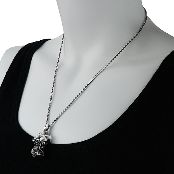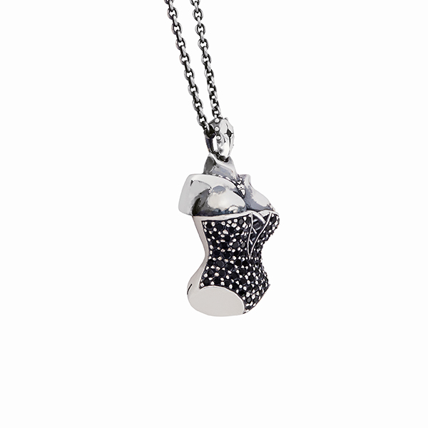 This necklace depicts a female bust in a corset of fine stones. It is an homage to sensual beauty, to the curvaceous forms of the pin-up.