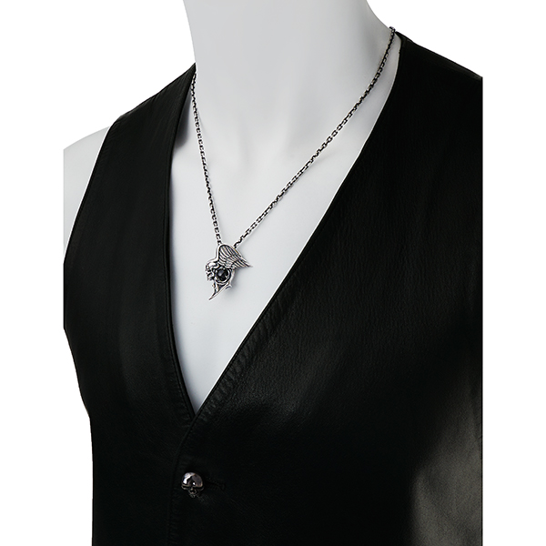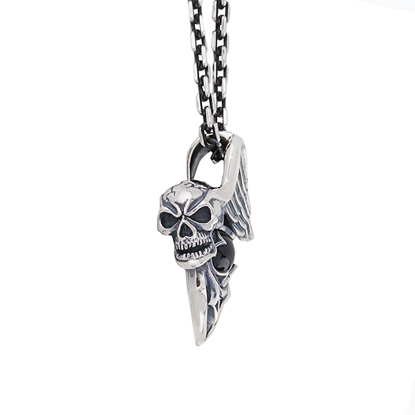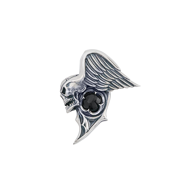 Like an angel of death, this winged skull serves as a reminder of the wistful realities of life. This jewel is set with a hand cut onyx cabochon.