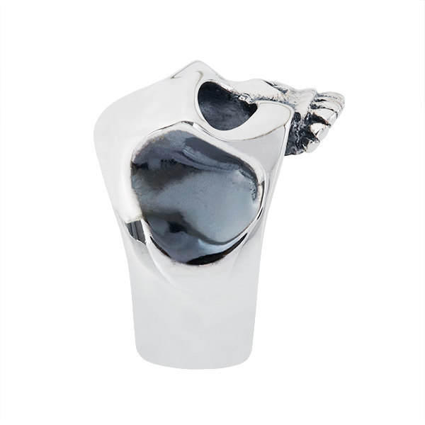 An extra-large crude skull. The thick and colossal forehead overhangs two dark eye sockets. Johnny Hallydays favourite motif.
