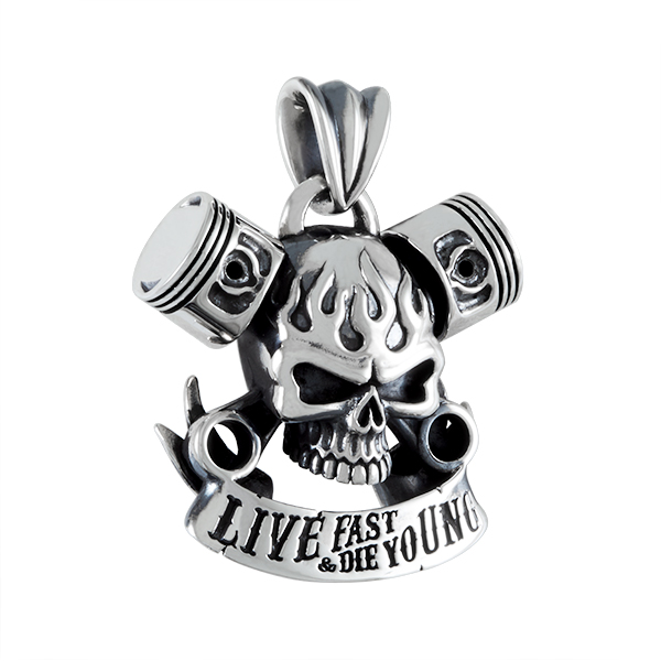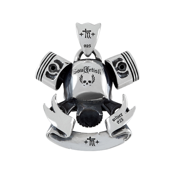 Skull flaming pendent and articulated pistons. Crazy biker jewels by Thierry Martino.