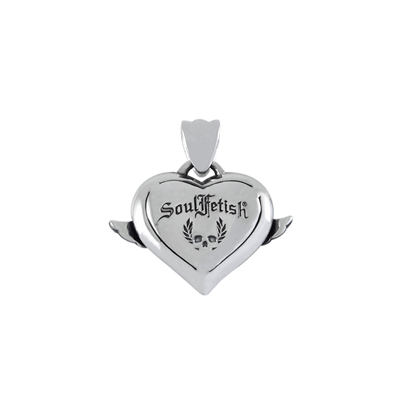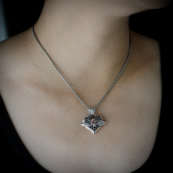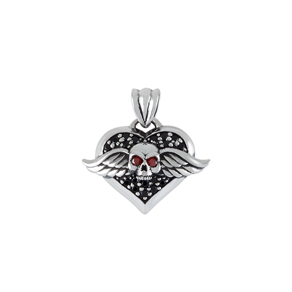 Winged skull on a heart set with stones.