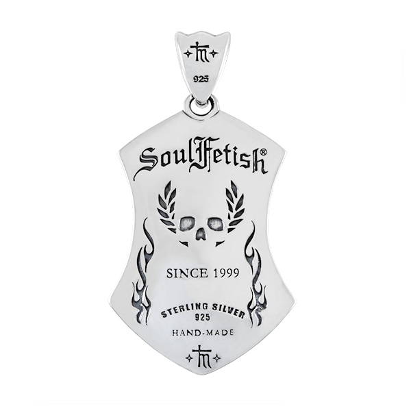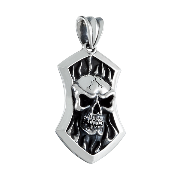 A skull that came out of hell in a burning shield. Dog-tag in true biker style.