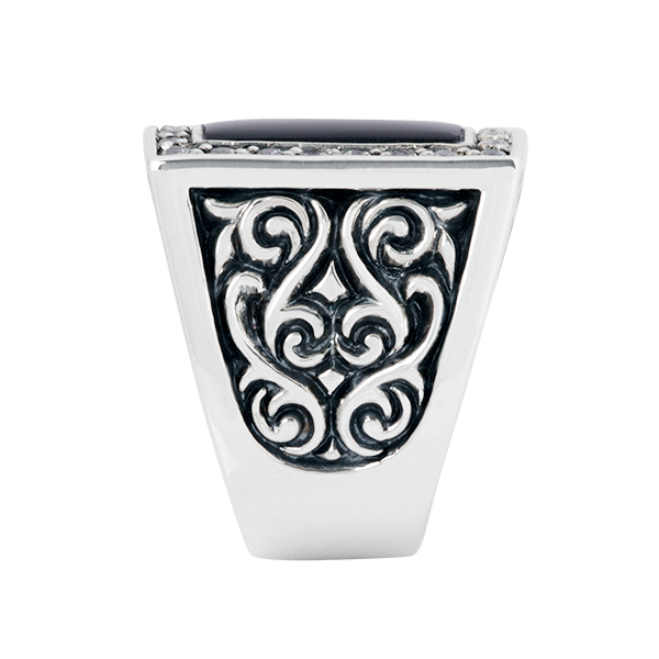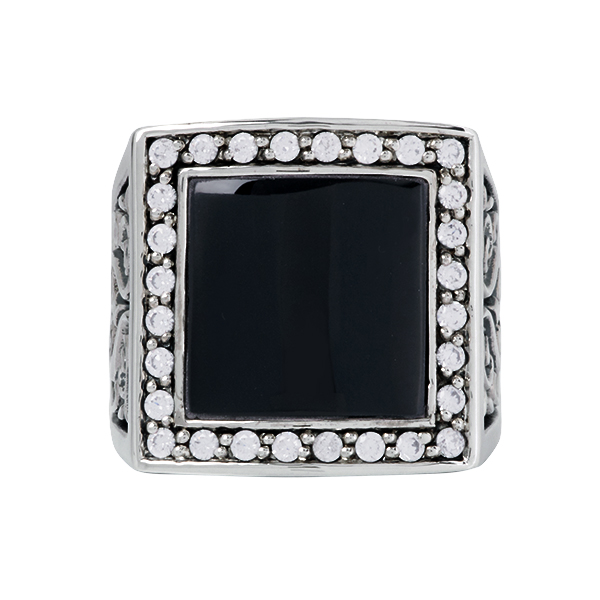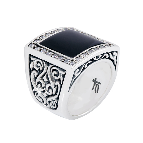 Monial: Meaning that which concerns monks. Square and majestic, inspired by the courtyards found in abbeys, the base of this ring is made up of an onyx insert in its centre and is framed by a mount of crystal circles. The silver band is composed of a pattern of arabesques finely cut on either side of the central motif, giving the ring a perfect finish. This is an item that refuses to be ignored. The centrepiece is available in either onyx or white agate. The border comes in onyx, garnet or zirconium.