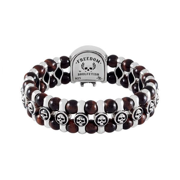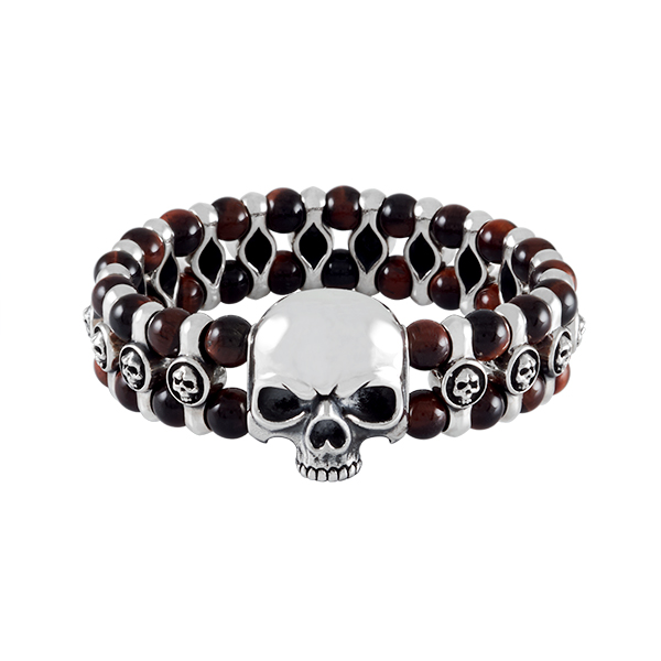Bracelet élastique et perles double rang avec comme pièce centrale ce skull au regard noir. Chaque pièce intercalaire est aussi ornée du même symbole.