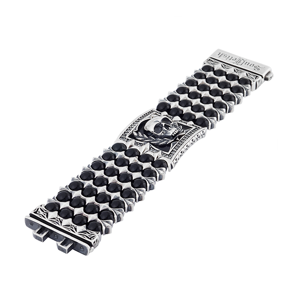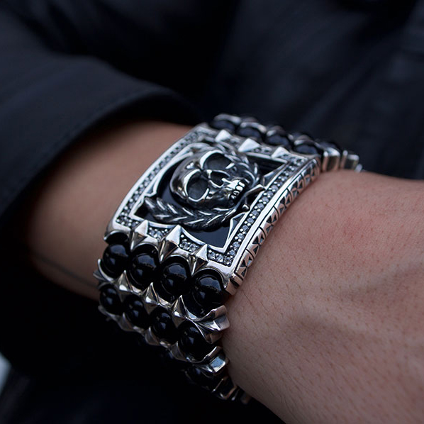 M=(poignet)ø 16-17.5cm Autre taille: contact@soulfetish.com Bracelet multi-rangs de perles d'onyx et crâne encadré de diamants. Une pièce impressionnante.