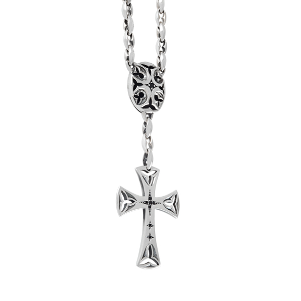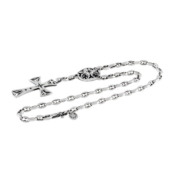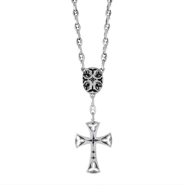 Luxueux collier chapelet se terminant par une croix ajourée de motifs gothiques et sertie de fine pierre. Au dos de la piéce centrale sont gravés les mots : "Smell the sea and feel the sky let your soul & spirit fly".