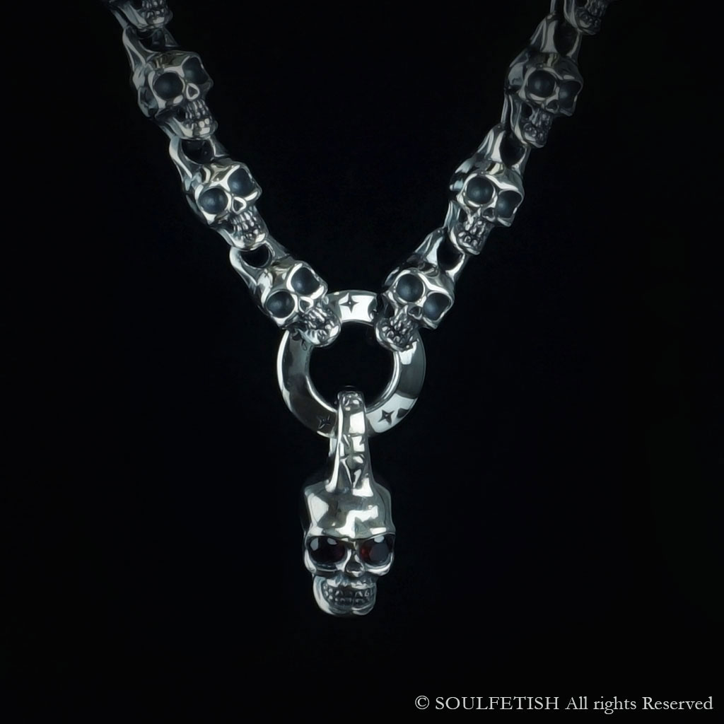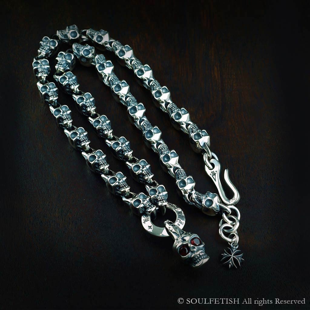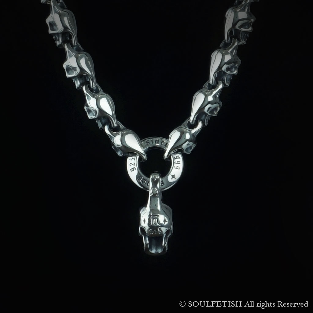 This necklace is made up of a mesh of skulls which seamlessly interlock.