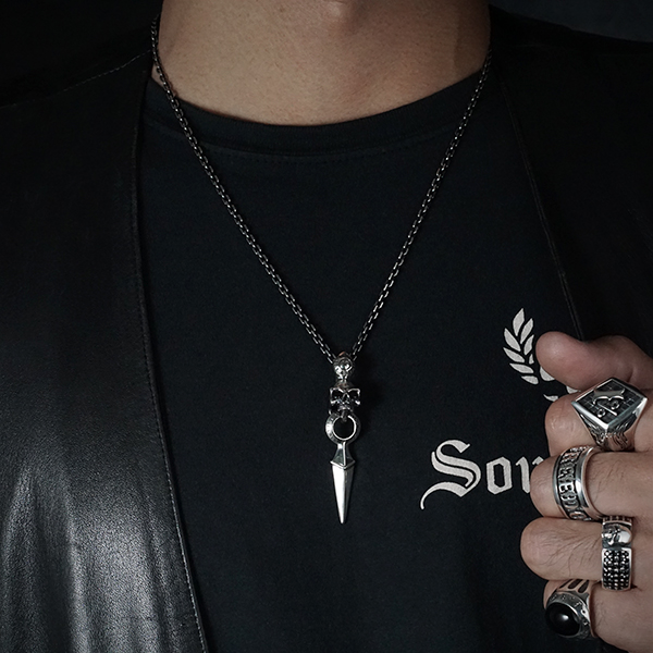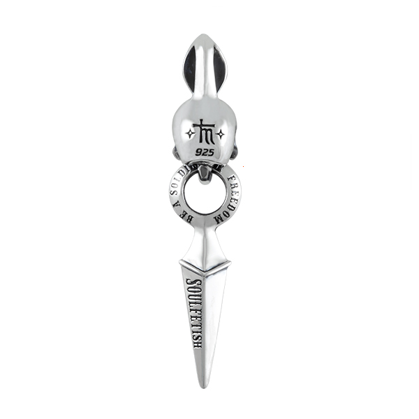 Pendentif crâne aux yeux sertis de pierres. Suspendu comme une pointe de flèche gravée de messages.