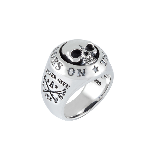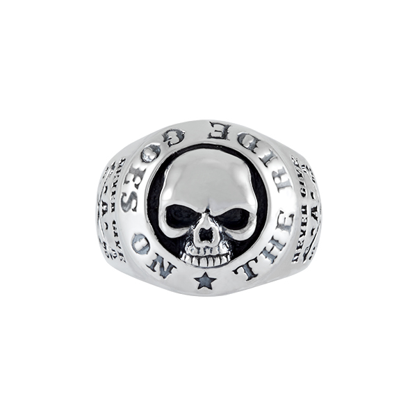 Bague argent massif dans le plus pur esprit biker. Un crâne et des messages bien clairs....