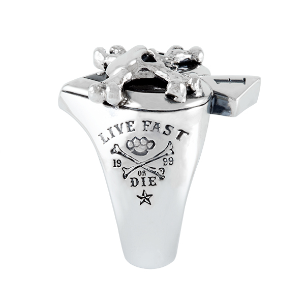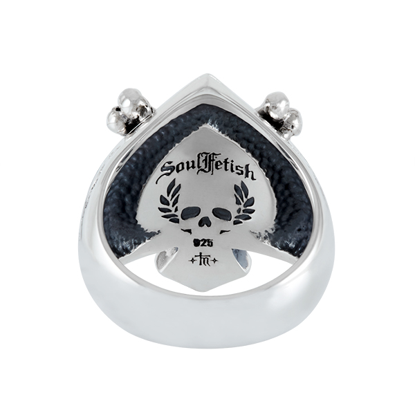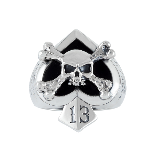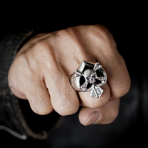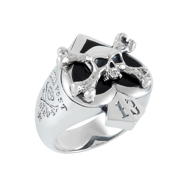 Bague porte chance "as de pique" sertie d'Onyx et surmonté d'un crâne. Sur les cotés gravé dans l'argent "Live fast"comme une invitation. Version XL.
