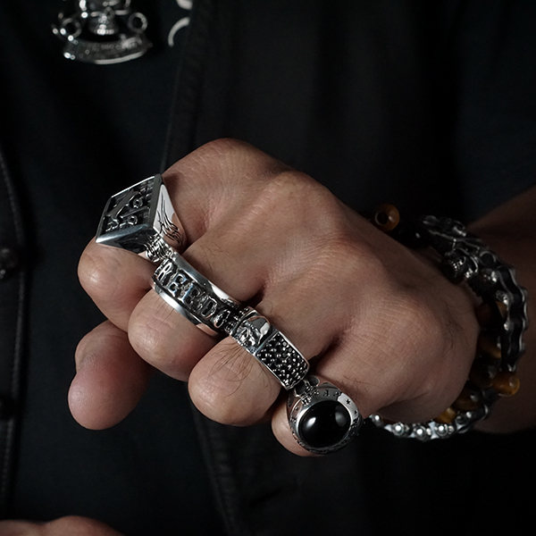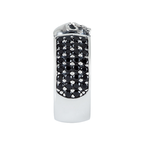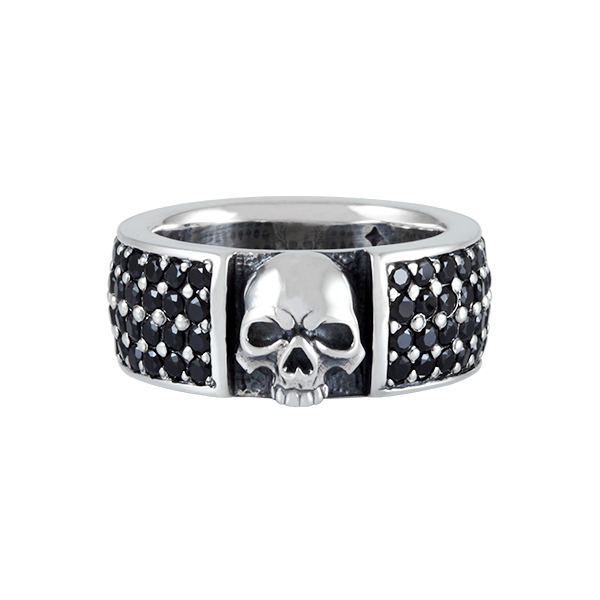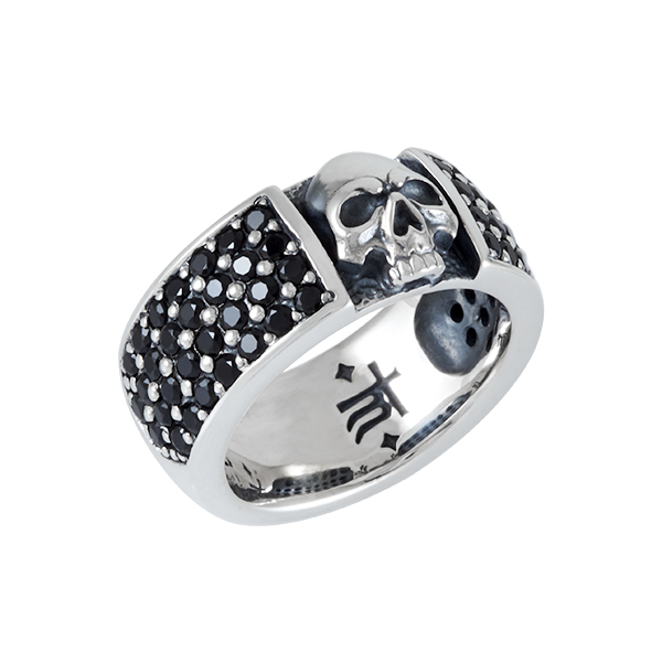 Anneau massif pavé de douzaines de brillants avec au centre un crâne scrutateur. Un classique de la bague Biker by Thierry Martino.