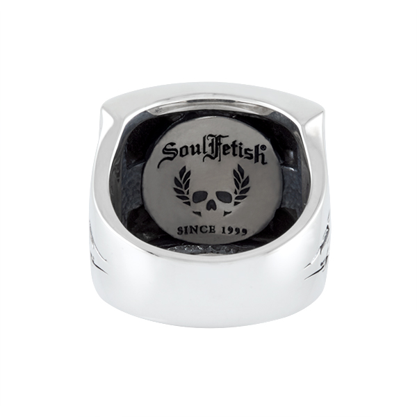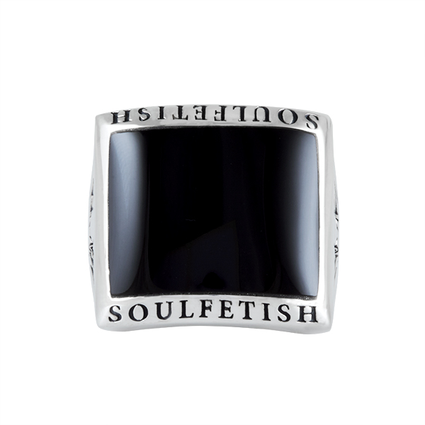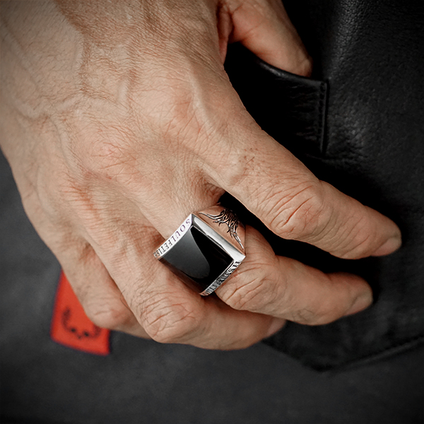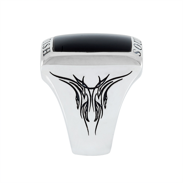 Large chevalière sertie d'Onyx épousant parfaitement le contour du doigt pour être portée avec des gants. Un superbe "pinstrip" orné les cotés de cette belle ambassadrice de la collection Freedom.