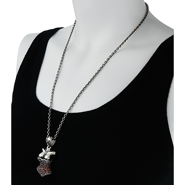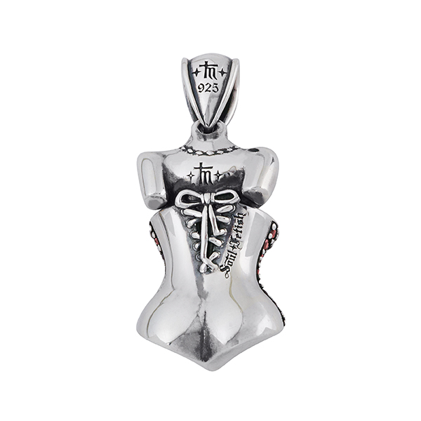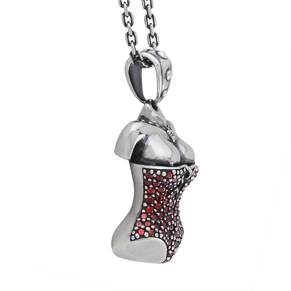 Le corset est le symbole de la féminité vu par SFH. Celui-ci est pavé de pierres rouges. Hommage aux pin ups et à leur égérie moderne Dita Von Teese.
